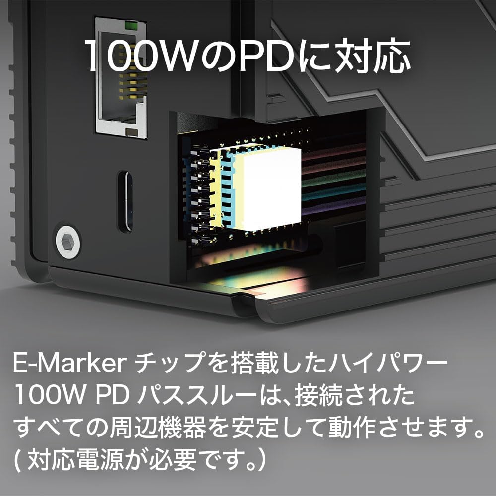 100W PD 給電対応:USB-C PD 対応デバイスへ高速給電。