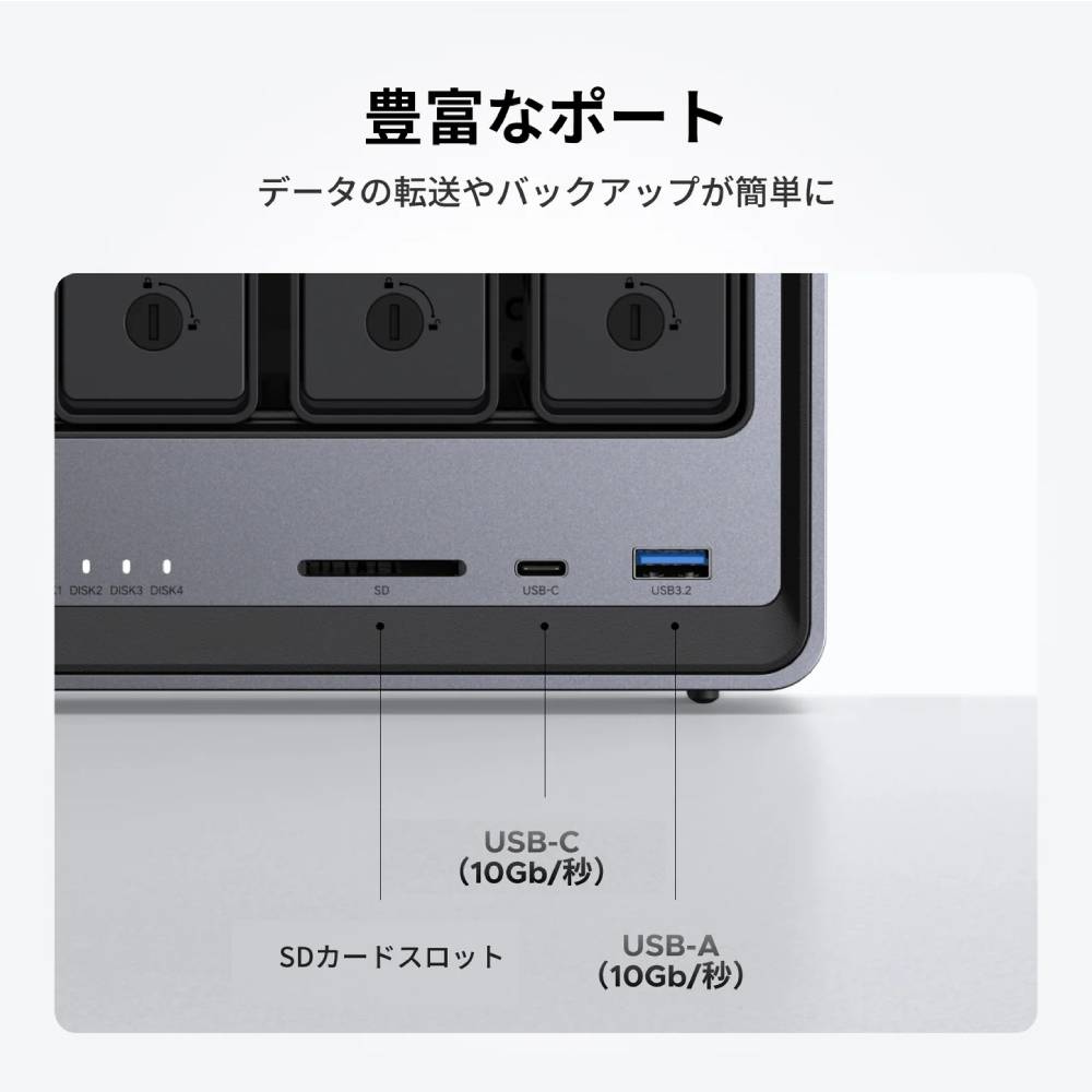 デュアル 2.5GbE ポートを備え、最大136TB(30TB×4+8TB×2)までのストレージ拡張が可能。
